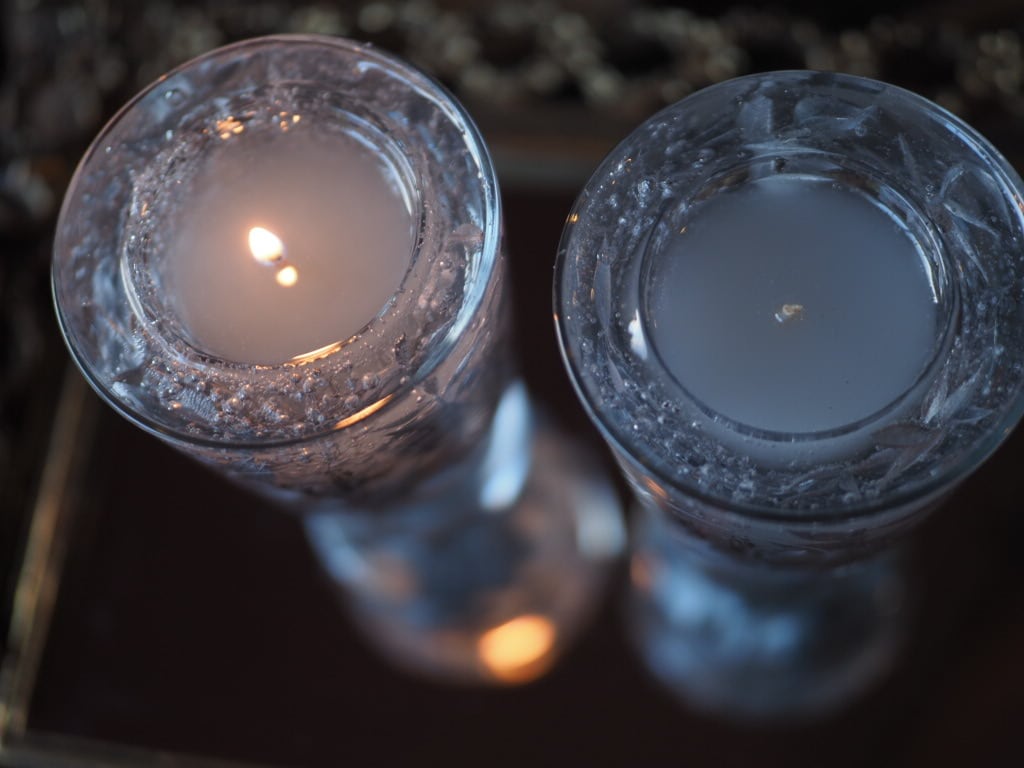 2層のグラスの間にシルバーカラーの花材をアレンジした作品です。灯し終えた後は、内側グラスにティーライトキャンドルを入れ、キャンドルホルダーとしてもご使用可能です。