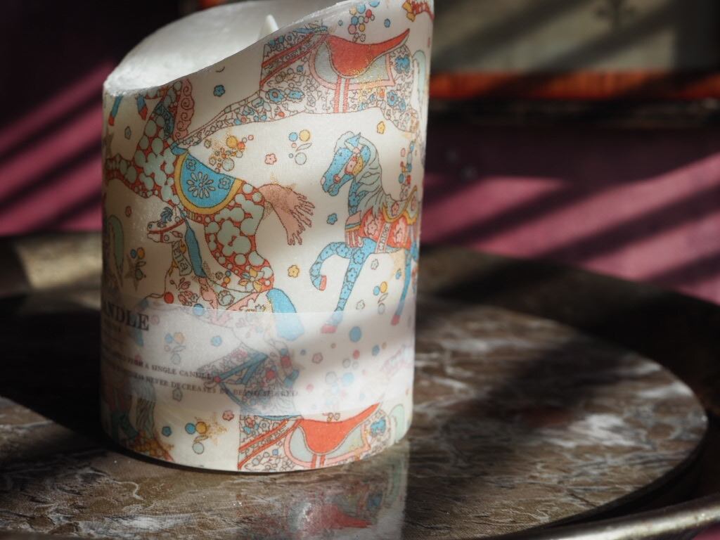 カラフルなお馬たちが行進する、リバティの新作柄を纏ったLEDキャンドル。