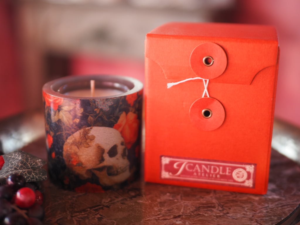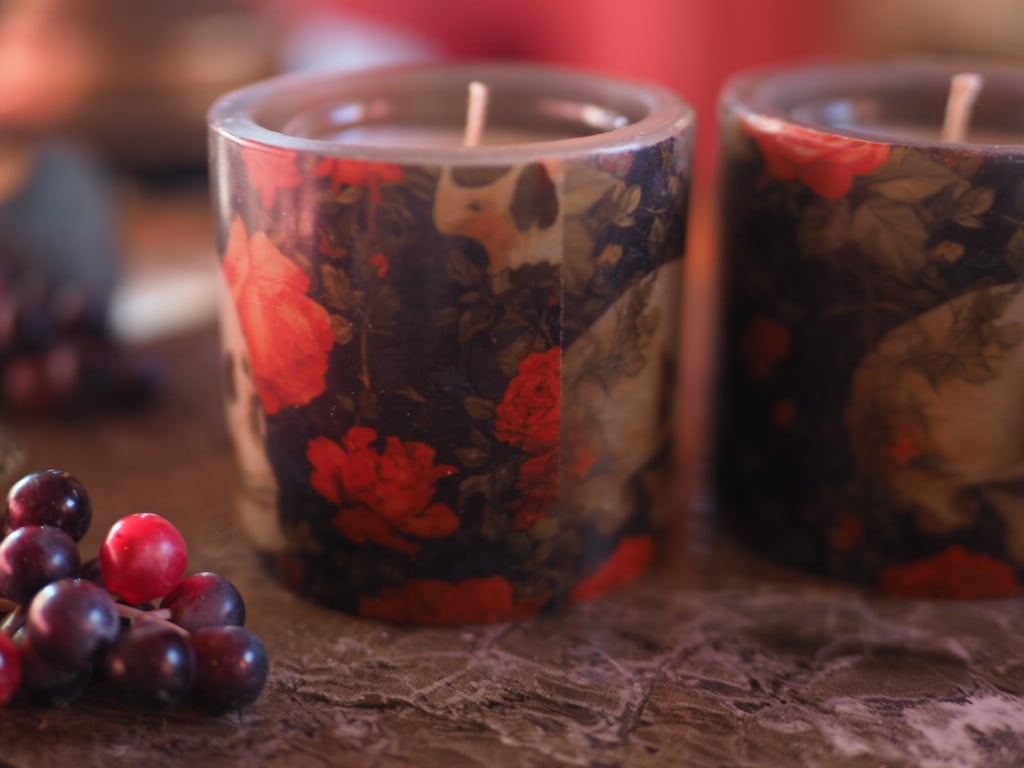 パラフィンワックスの中に、この作品のためにセレクトしたデザインファブリックを閉じ込めて制作した、Jcandleオリジナルのキャンドルランタン作品です。