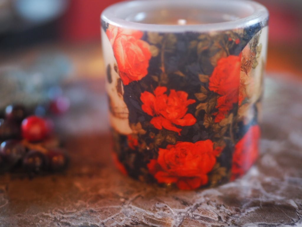 パラフィンワックスの中に、この作品のためにセレクトしたデザインファブリックを閉じ込めて制作した、Jcandleオリジナルのキャンドルランタン作品です。