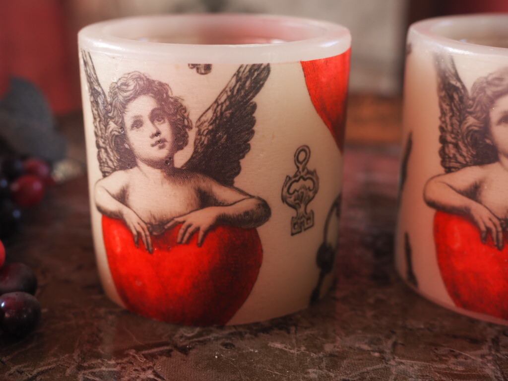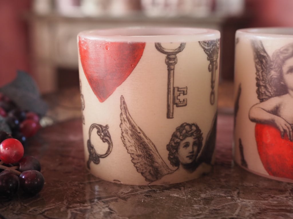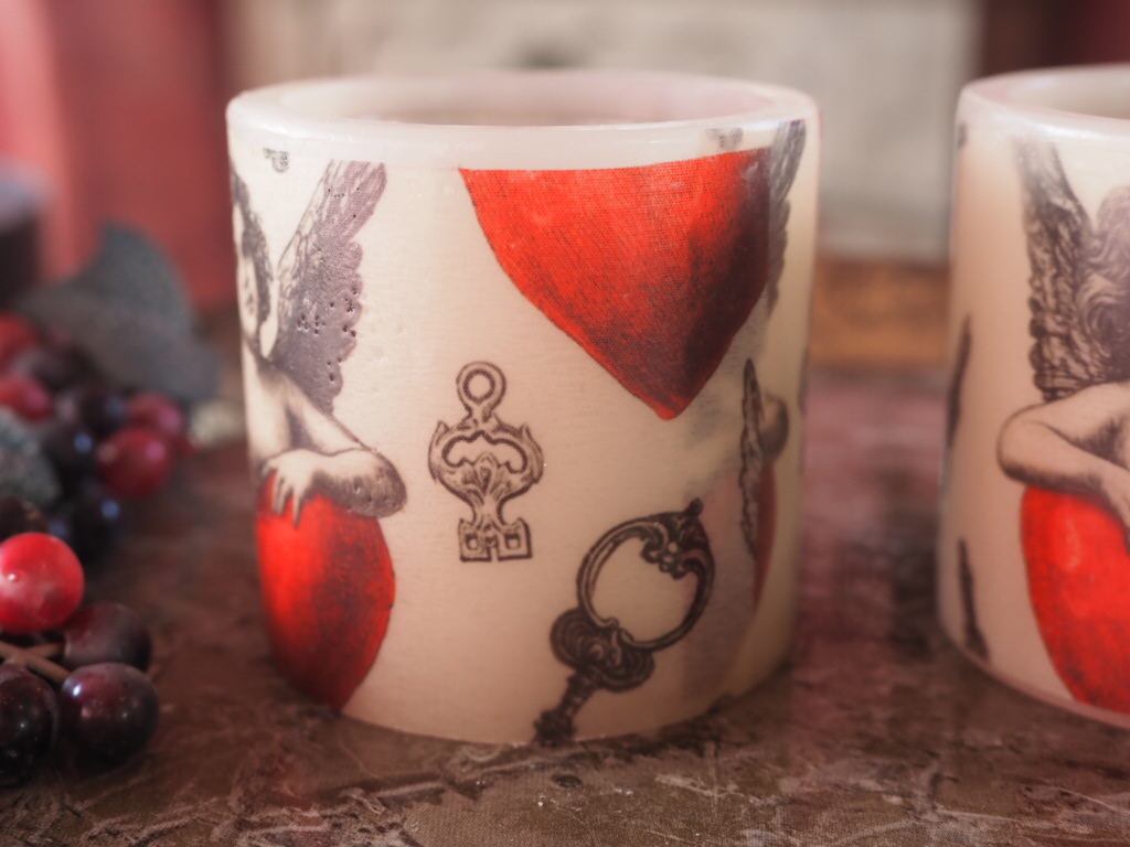 パラフィンワックスの中に、この作品のためにセレクトしたデザインファブリックを閉じ込めて制作したJcandleオリジナルのキャンドルランタン作品です。